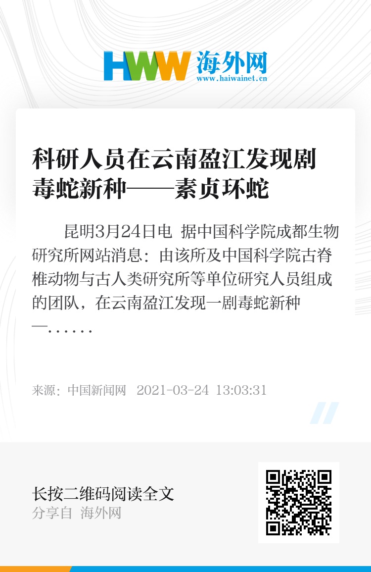 中新网昆明3月24日电 据中国科学院成都生物研究所网站消息:由该所及中国科学院古脊椎动物与古人类研究所等单位研究人员组成的团队,在云南盈江发现一剧毒蛇新种——素贞环蛇。这是中国学者首次对环蛇属物种进行命名。
