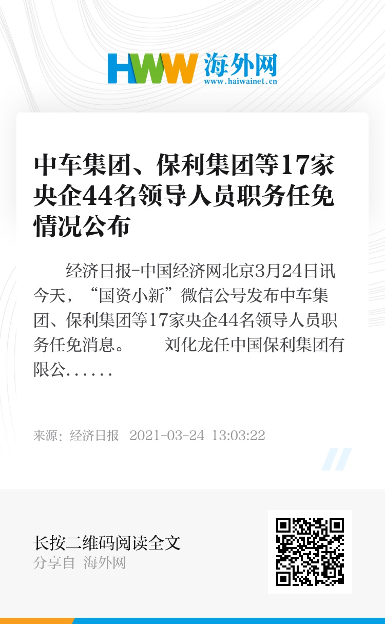 经济日报-中国经济网北京3月24日讯 今天,“国资小新”微信公号发布中车集团、保利集团等17家央企44名领导人员职务任免消息。