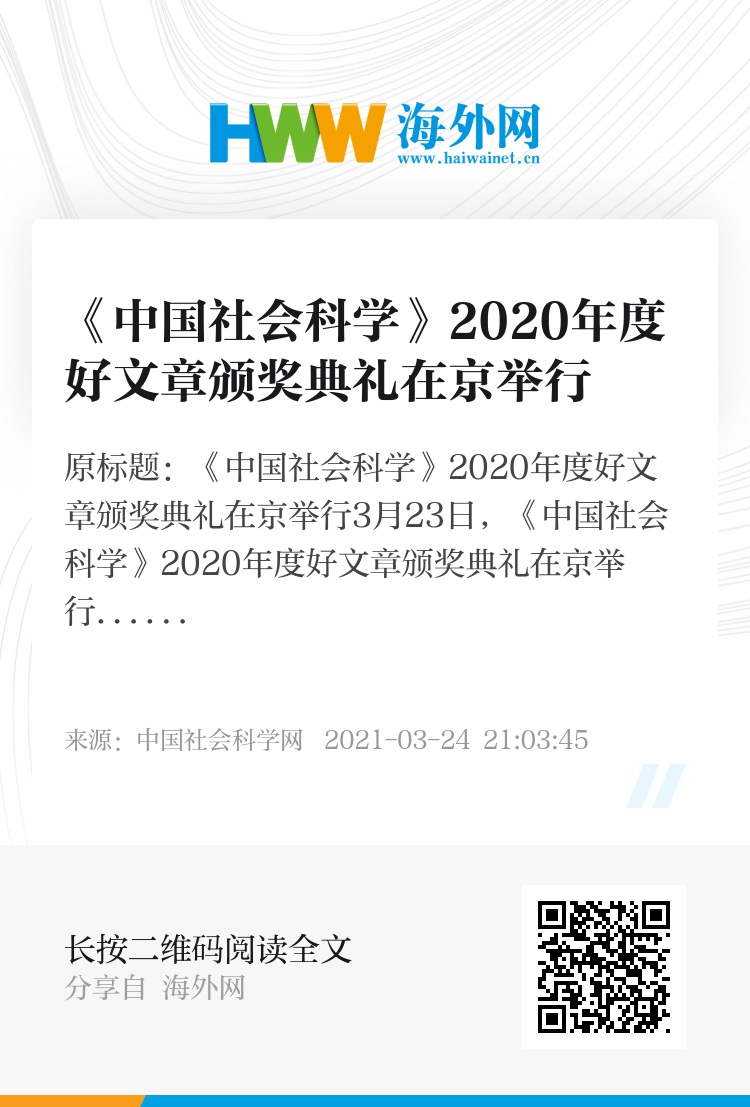 《美好社会:现代中国社会的历史展开与演化图景》《延安革命家的诗词创作实践及诗史价值》《金融市场与宏观经济的风险传染关系――基于混合频率的实证研究》《行政许可的民法意义》《牧区城镇化与草原生态治理》《范文澜与“汉民族形成问题争论”》《认知科学视域中隐喻的表达与理解》获评《中国社会科学》2020年度好文章。谢伏瞻、赵奇、方军以及《中国社会科学》2020年度好文章评选专家评审委员会代表、中国社会科学院学部委员、中国边疆研究所所长邢广程,中国社会科学院社会发展战略研究院院长张翼共同为获奖文章作者和责任编辑颁奖。