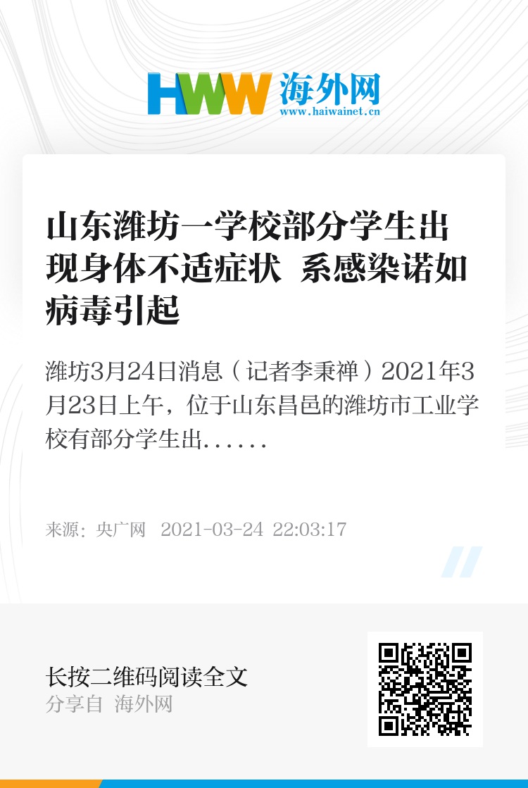 经流行病学调查,有部分学生出现身体不适症状,其中4名学生到医疗机构就诊,无重症或住院情况。昌邑市疾控中心、市场监督管理局分别采集呕吐物、排泄物、食品食材等样品送实验室检测。经检测,在排泄物中检测出诺如病毒,初步分析因感染诺如病毒引起。目前,已组织对校园进行全面消杀,并向学生普及诺如病毒防控知识和预防措施,具体原因正在进一步调查核实中。