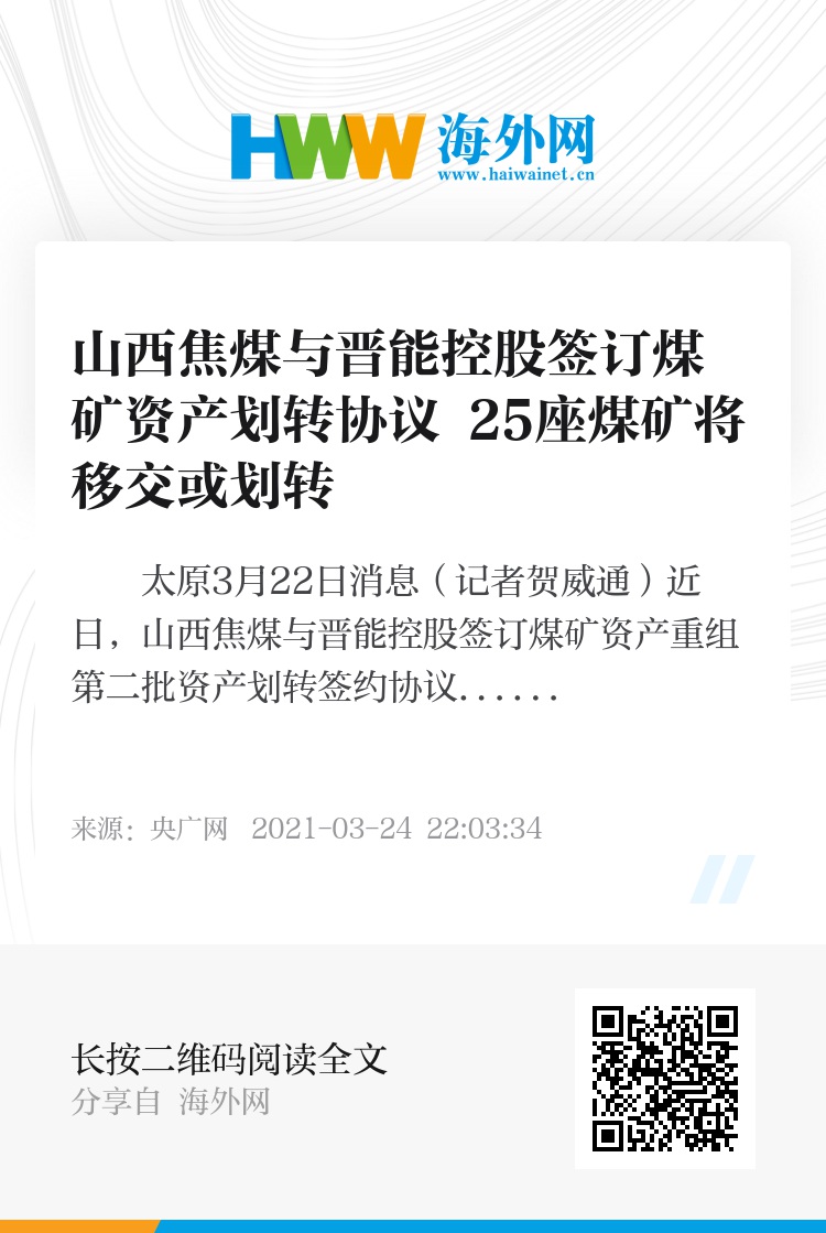 央广网太原3月22日消息(记者贺威通)近日,山西焦煤与晋能控股签订煤矿资产重组第二批资产划转签约协议。山西焦煤所属4座煤矿移交、划转至晋能控股,产能660万吨。晋能控股所属21座煤矿移交、划转至山西焦煤,产能2190万吨。