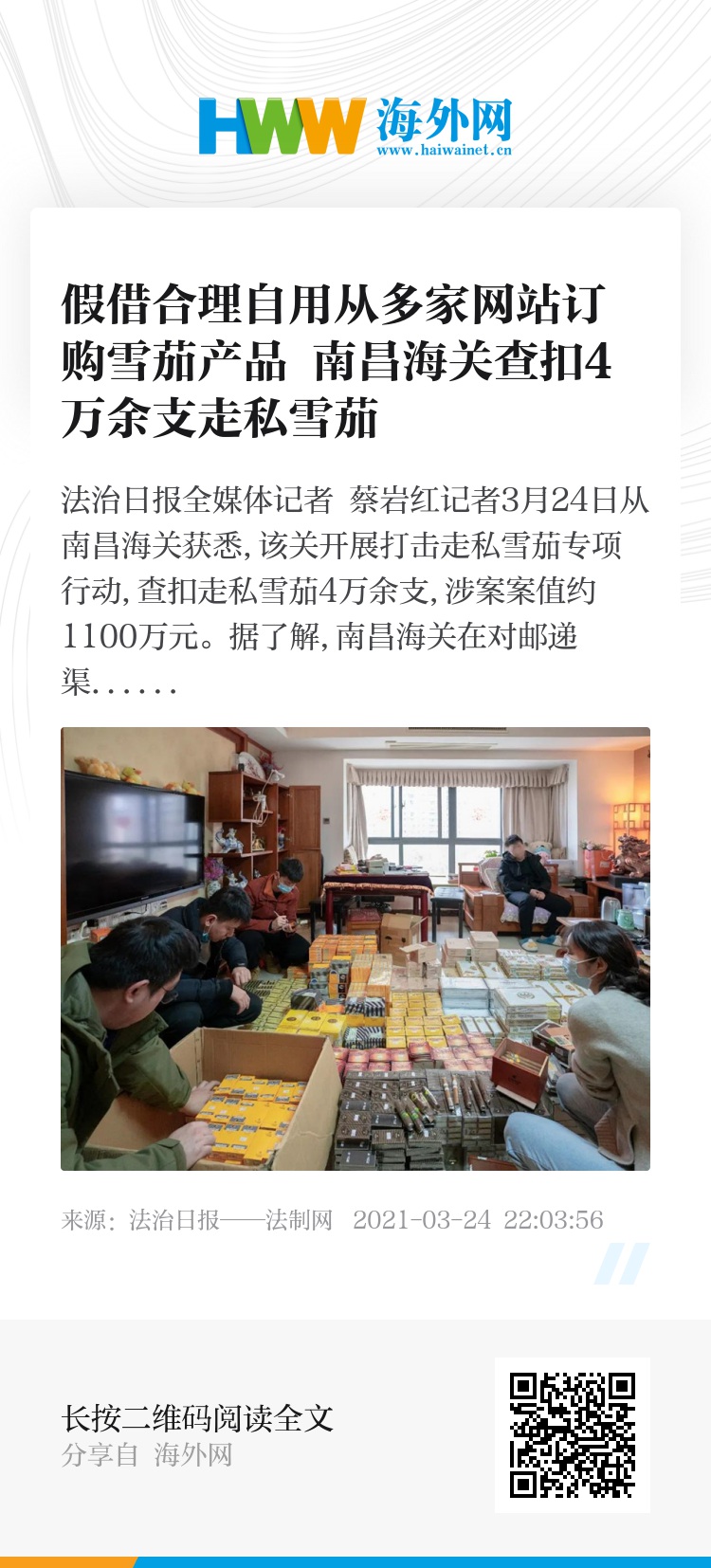 记者3月24日从南昌海关获悉,该关开展打击走私雪茄专项行动,查扣走私雪茄4万余支,涉案案值约1100万元。