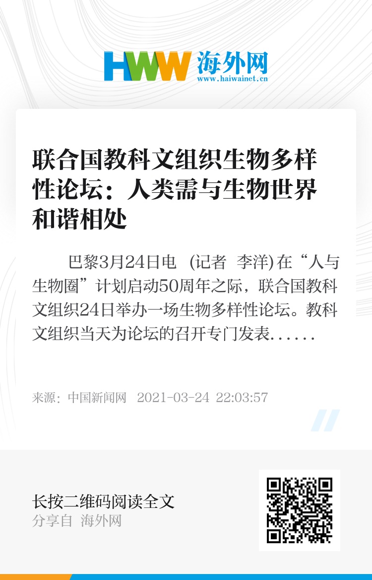 中新网巴黎3月24日电 (记者 李洋)在“人与生物圈”计划启动50周年之际,联合国教科文组织24日举办一场生物多样性论坛。教科文组织当天为论坛的召开专门发表的评论文章指出,人类需与生物世界和谐相处。