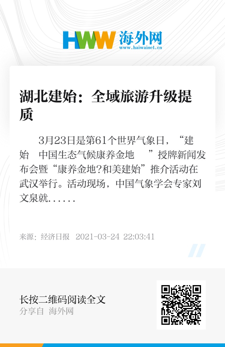 2019年12月,受建始县政府委托,中国气象学会组织专家组对建始进行现场考察、技术咨询、联合论证。去年9月25日论证会上,专家组组长、中国工程院院士丁一汇宣布:通过专家现场实地考察和专家组对《湖北建始生态旅游气候资源评估报告》的咨询评议,一致认为,建始气候宜居宜养宜游、生态环境和谐优美、旅游资源丰富多彩,专家组建议中国气象学会授予建始“建始?中国生态气候康养金地”称号。