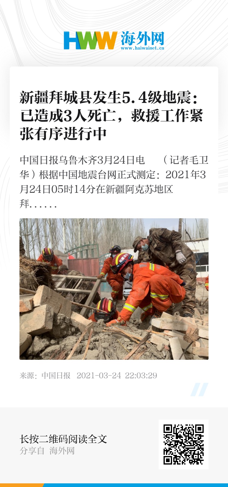 中国日报乌鲁木齐3月24日电 (记者毛卫华)根据中国地震台网正式测定:2021年3月24日05时14分在新疆阿克苏地区拜城县查尔其镇附近发生(北纬41.70度,东经81.11度)发生5.4级地震,震源深度10千米,拜城县、阿克苏市等多地有震感。