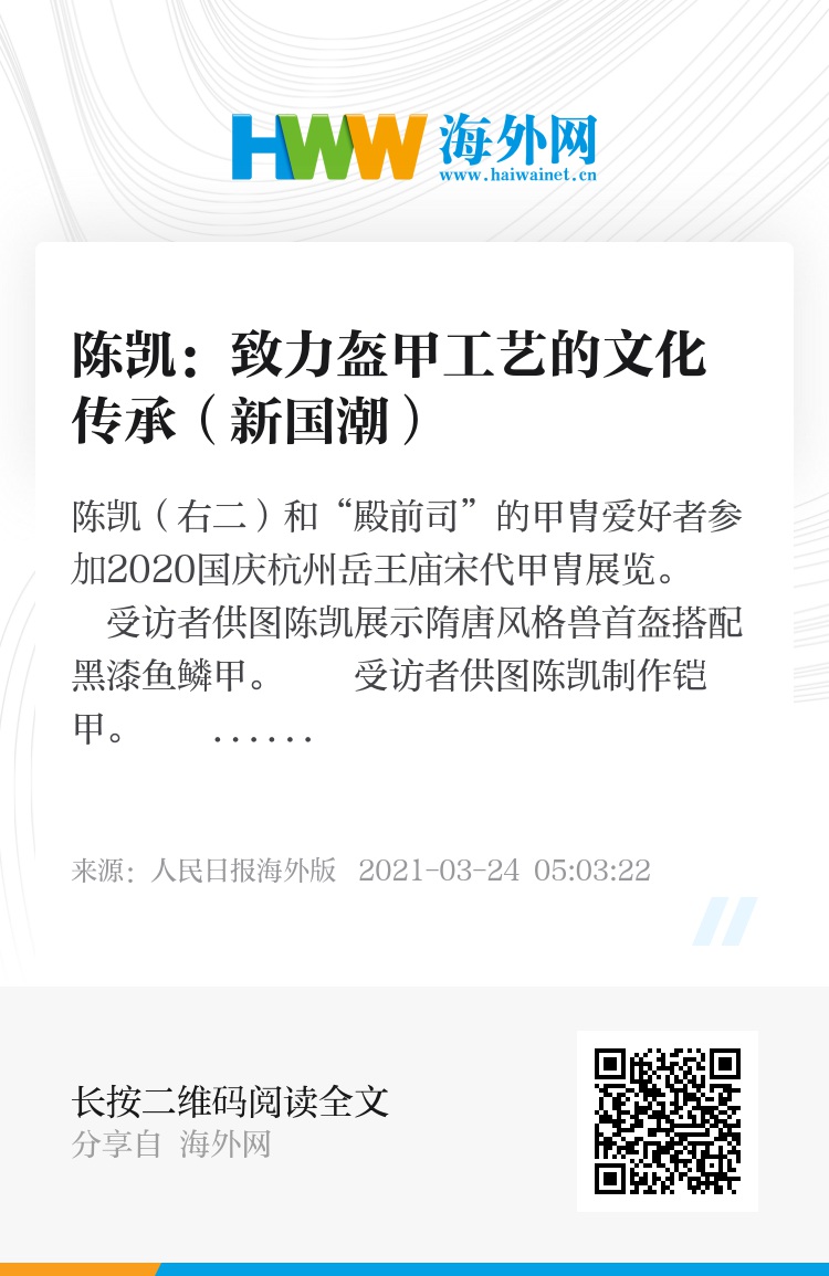 甲胄是头盔和铠甲的合称,也被称为盔甲。虽然历史悠久的中国甲胄已退出了现代战场,但甲胄文化和蕴含在其中的民族情怀并没有湮灭。陈凯结合古代典籍和出土文物,精心设计和制作中式铠甲,在钻研手工技艺之外,也通过线上线下的讲演、展示等活动,普及甲胄知识,致力于中华优秀传统文化的传承和发扬。
