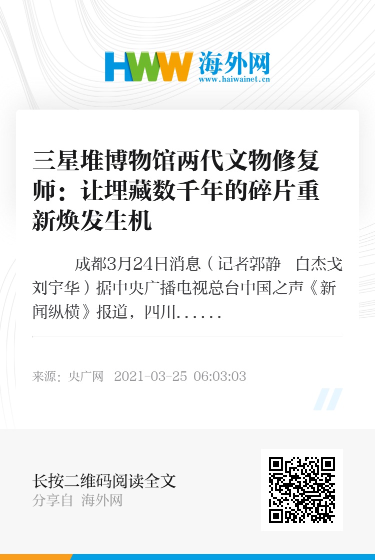 央广网成都3月24日消息(记者郭静 白杰戈 刘宇华)据中央广播电视总台中国之声《新闻纵横》报道,四川三星堆遗址新发现六个祭祀坑,文物正在陆续出土,经过分析评估后,会交给文物修复师完成拼接、修补等工作。日前,记者专访了三星堆博物馆的两代文物修复师郭汉中和杨平。