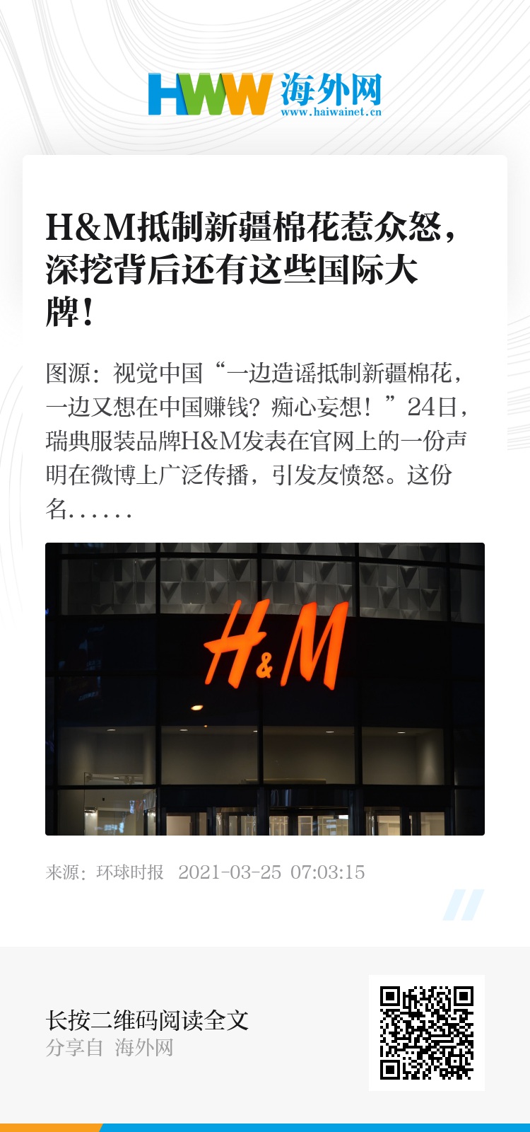 24日当天,“H&M抵制新疆产品”“H&M碰瓷新疆棉花”等话题在微博上持续发酵,网友纷纷表示,“希望这些扭曲事实又想挣中国人钱的公司好自为之”“新疆棉花不吃这一套”。此后,淘宝、京东、拼多多等电商平台下架H&M相关产品。小米、华为、vivo、腾讯等多款手机应用商店下架H&M商城App。曾与H&M有商务合作的艺人黄轩、宋茜先后发表声明表示与H&M已无合作关系。H&M中国24日晚在微博发表声明称,H&M集团一如既往地尊重中国消费者,我们致力于在中国的长期投入与发展,目前在中国与超过350家生产厂商合作,为中国及全球消费者提供符合可持续发展原则的服饰产品。但这份姗姗来迟的声明显然无法让网友买账,有网友表示:“给大家简单翻译一下就是:老子没做错。”