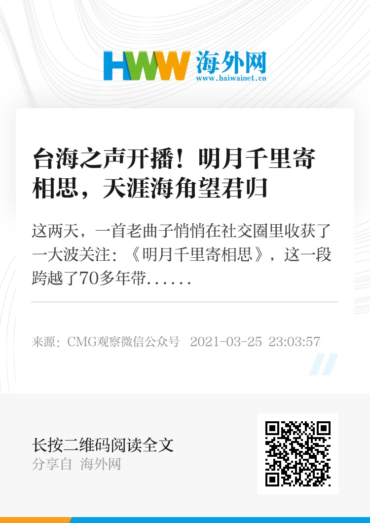 这两天,一首老曲子悄悄在社交圈里收获了一大波关注:《明月千里寄相思》,这一段跨越了70多年带着浓浓思念柔情的音乐,从此有了新的含义——“台海之声”频率的开始曲。