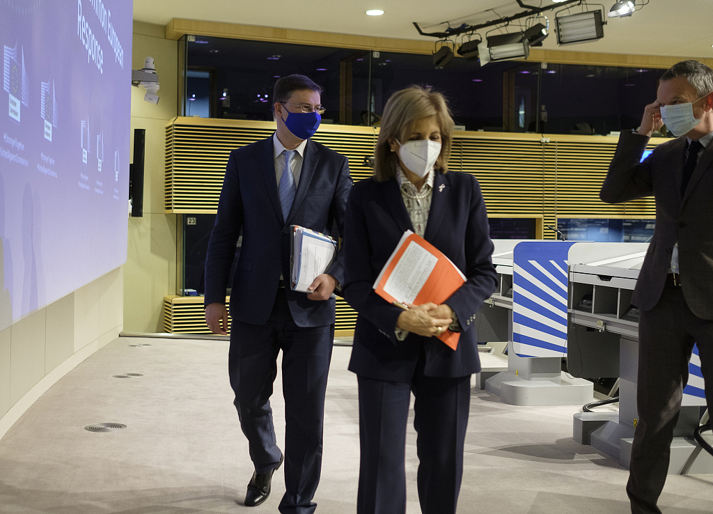 欧盟委员会专员Valdis Dombrovskis和欧盟卫生事务专员Stella Kyriakides出席新闻发布会。图片来源:视觉中国
