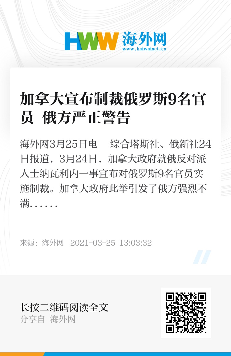 海外网3月25日电 综合塔斯社、俄新社24日报道,3月24日,加拿大政府就俄反对派人士纳瓦利内一事宣布对俄罗斯9名官员实施制裁。加拿大政府此举引发了俄方强烈不满,俄罗斯驻加拿大大使馆对加方发出严正警告,告诫加方勿以制裁的方式与俄方展开对话,加方需要思考下自己过去所犯下的人权罪行。