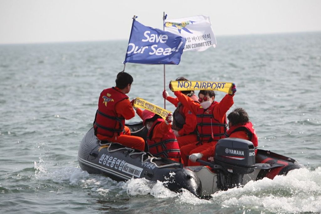当地时间3月26日,韩国釜山民众在海上抗议在当地建立新机场,他们认为新机场的设立会导致环境破坏。目前,执政党力推的新机场候选地是隶属于釜山市的加德岛。图片来源:人民视觉/视觉中国