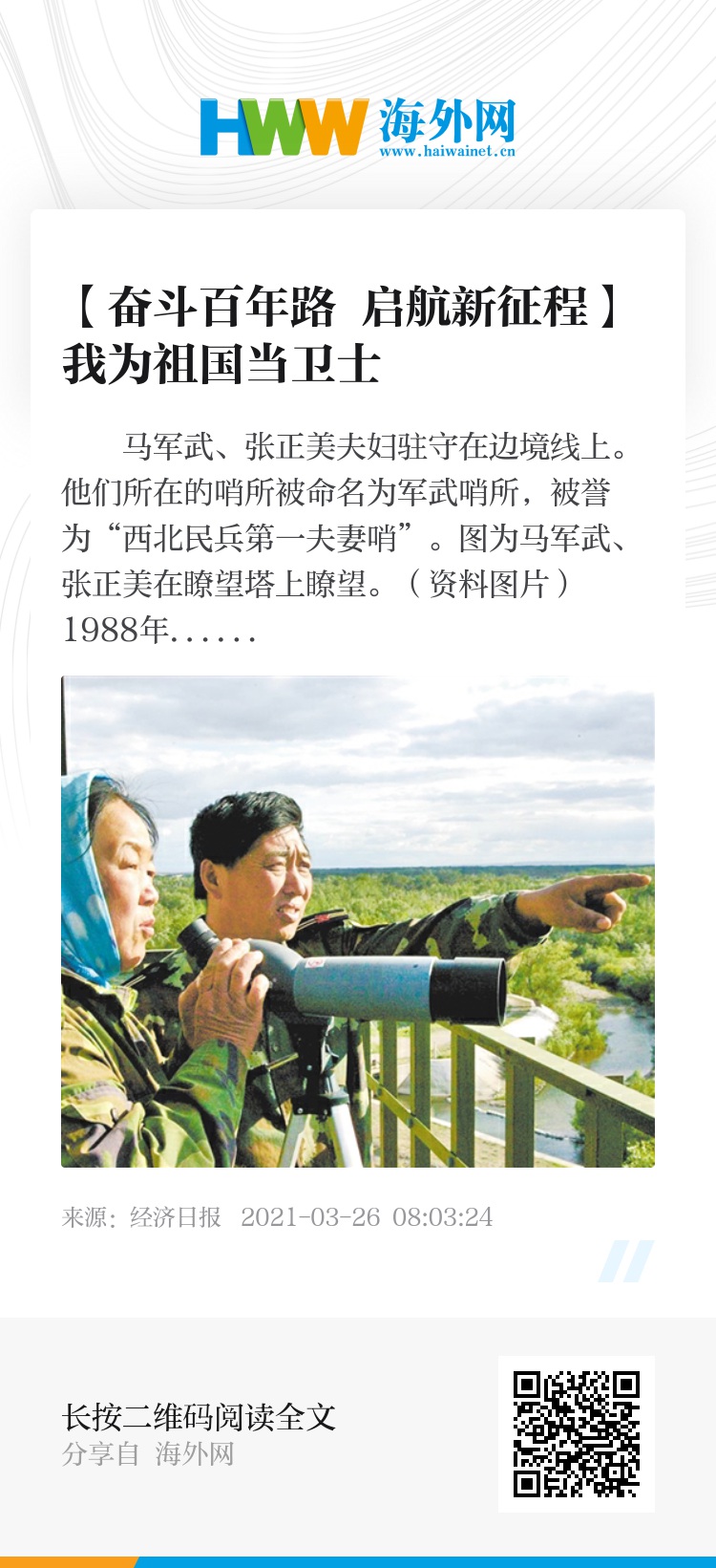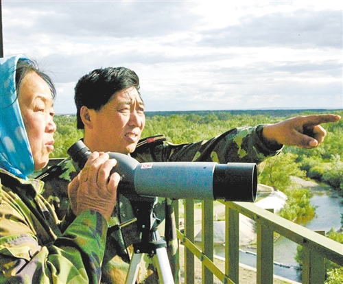马军武、张正美夫妇驻守在边境线上。他们所在的哨所被命名为军武哨所,被誉为“西北民兵第一夫妻哨”。图为马军武、张正美在瞭望塔上瞭望。(资料图片)