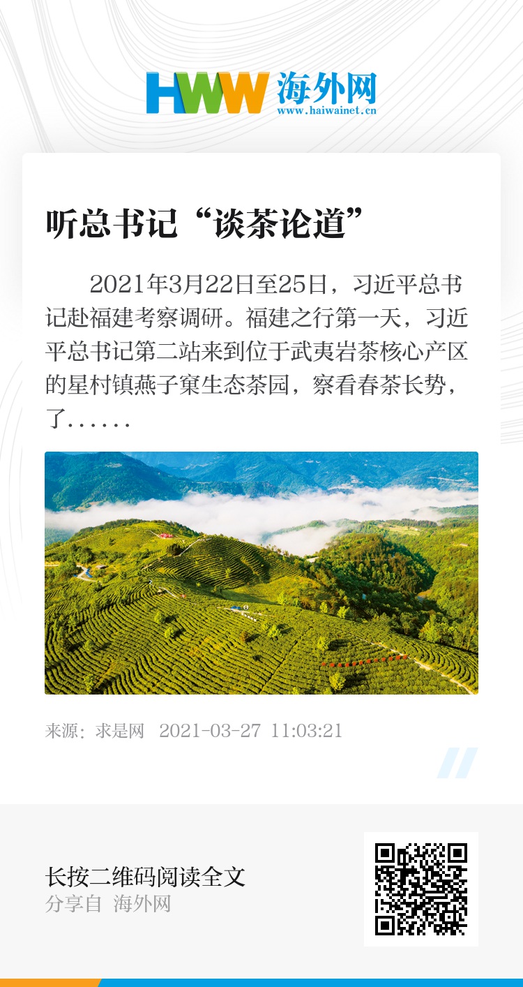 2021年3月22日至25日,习近平总书记赴福建考察调研。福建之行第一天,习近平总书记第二站来到位于武夷岩茶核心产区的星村镇燕子窠生态茶园,察看春茶长势,了解当地茶产业发展情况,并强调:要统筹做好茶文化、茶产业、茶科技这篇大文章。