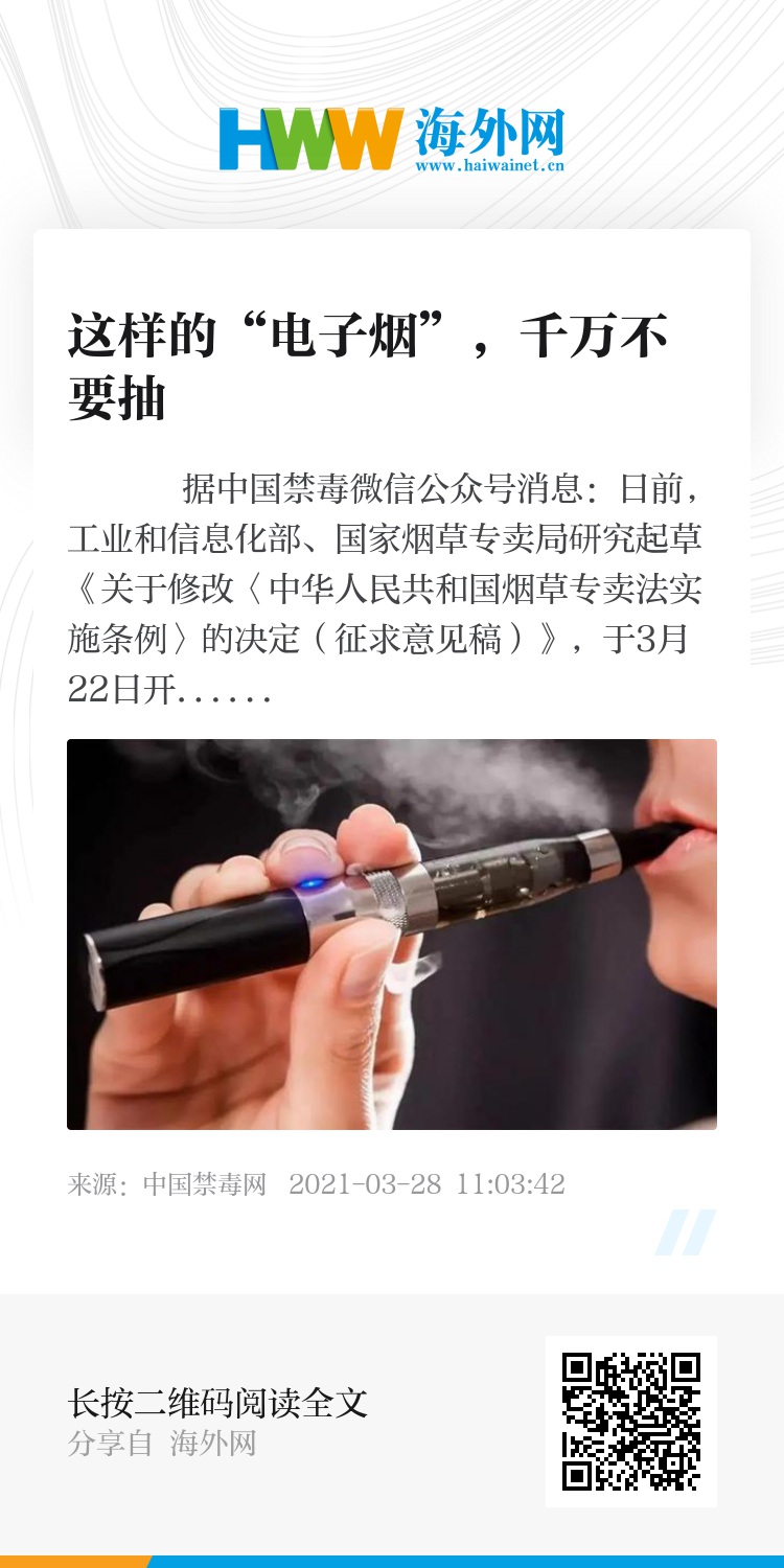 据中国禁毒微信公众号消息:日前,工业和信息化部、国家烟草专卖局研究起草《关于修改〈中华人民共和国烟草专卖法实施条例〉的决定(征求意见稿)》,于3月22日开始向社会公开征求意见。其中明确指出,电子烟拟参照卷烟管理,引发巨大关注。