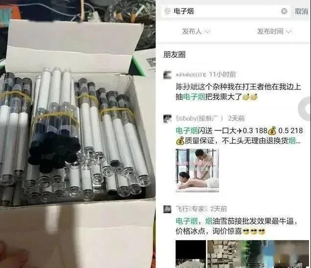 有些不法分子假借电子烟添加违禁的毒品成分,甚者更是猖狂地在朋友圈进行兜售、贩卖。例如大麻电子烟、“上头”电子烟等,宣称可以让人“合法上头”“合法飞行”。