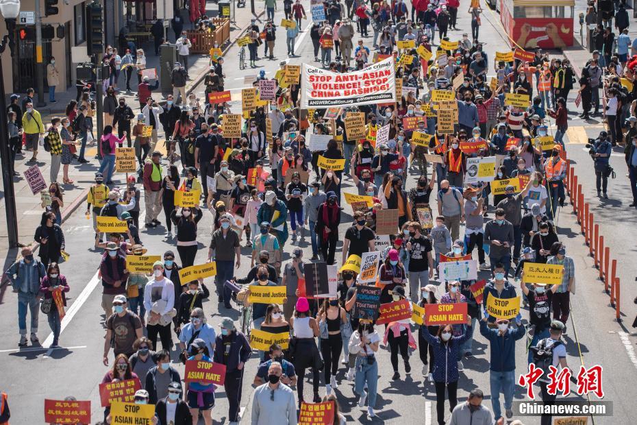 当地时间3月27日,美国加州旧金山大批民众走上街头,抗议针对亚裔的歧视和暴力行为。当日,美国多地爆发反对歧视亚裔的游行和集会。 中新社记者 刘关关 摄