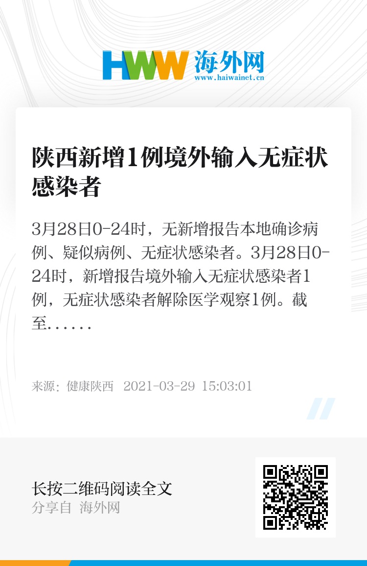 今日新增:陕西新增1例境外输入无症状感染者为3月19日由阿联酋迪拜至北京CA942航班乘客。3月19日CA942航班到达第一入境点西安咸阳国际机场后,航班全部人员落实海关检疫、核酸检测、点对点转运、隔离医学观察等闭环管理措施,无陕西省内自行活动轨迹。