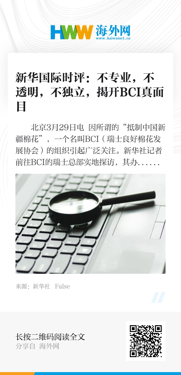 尽管BCI宣扬“体面劳动”与“环保高标准”,但其自身操作既不体面、更无标准。尽管BCI声称自己脱胎于世界自然基金会倡议,但该基金会向新华社记者证实,BCI从2009年起已与基金会没有关系。这样一个出身可疑、决策失据、自相矛盾、以圈钱为目的的“非营利性”机构,竟然企图通过自身所做的决定抹黑中国、打压蓬勃发展的中国棉纺织产业,实在是不自量力,荒唐可笑。(新华社记者杨骏 陈俊侠)