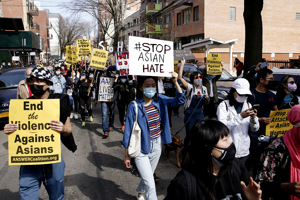 当地时间2021年3月27日,美国纽约,当地爆发亚裔反歧视大游行。图片来源:人民视觉