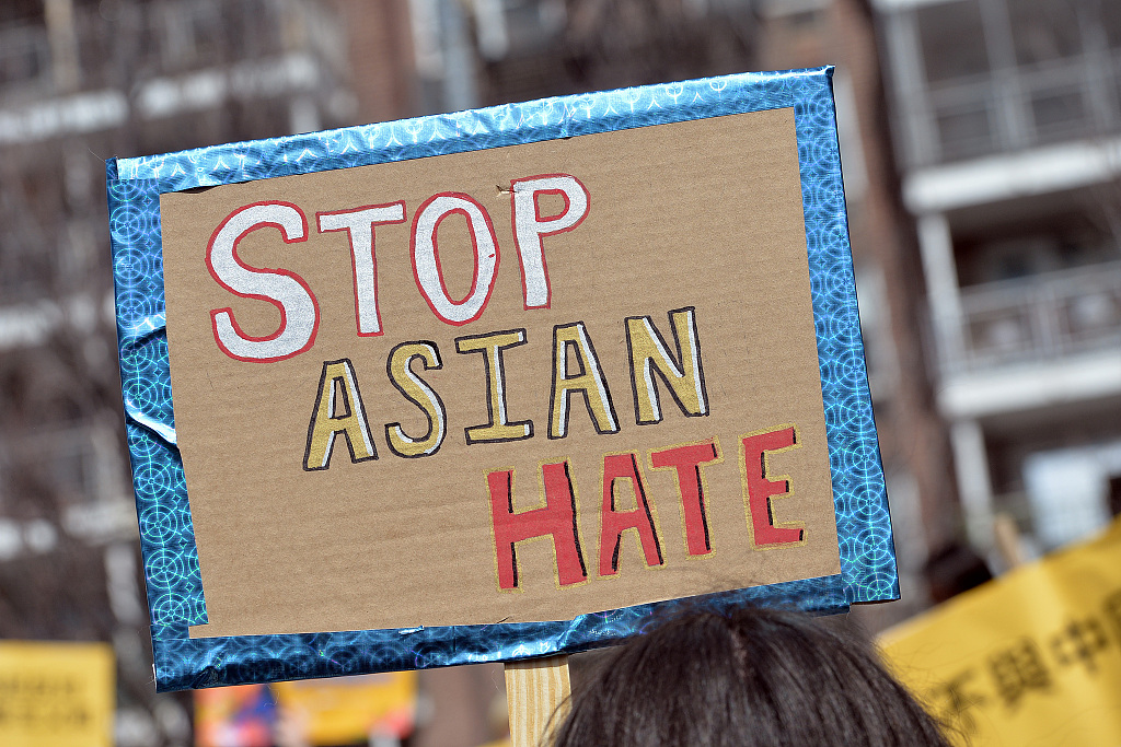 当地时间2021年3月27日,美国纽约,当地爆发亚裔反歧视大游行。抗议人群在聚集后,高喊“亚裔美国人不会噤声”“停止仇恨、停止暴力”“我们要反击”等口号,手持“停止仇恨亚裔人”“向种族歧视说不”等标语在街道进行游行。图片来源:人民视觉