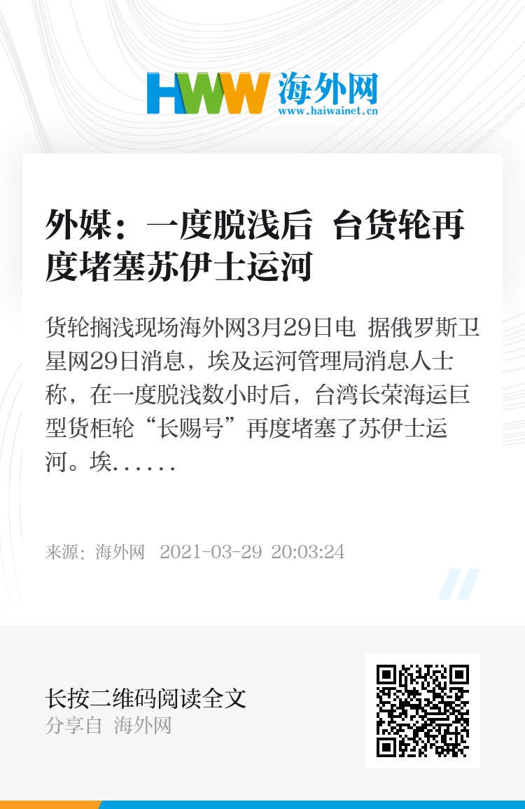 海外网3月29日电 据俄罗斯卫星网29日消息,埃及运河管理局消息人士称,在一度脱浅数小时后,台湾长荣海运巨型货柜轮“长赐号”再度堵塞了苏伊士运河。