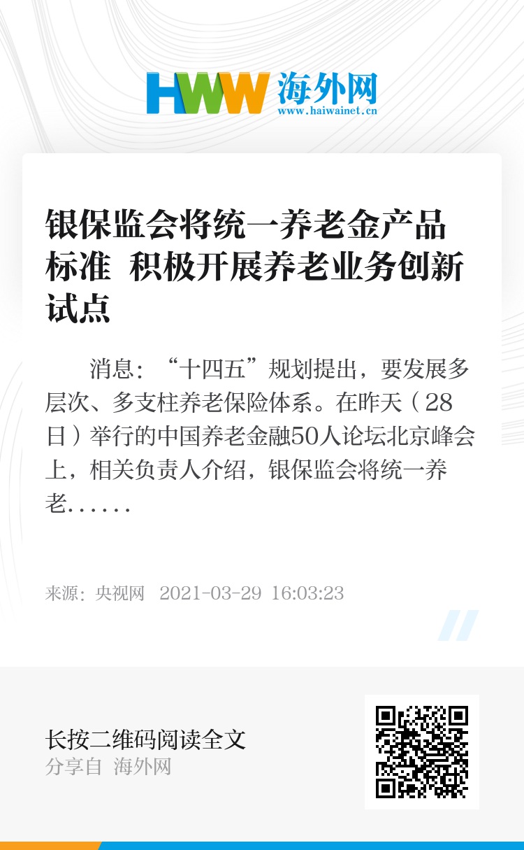 央视网消息:“十四五”规划提出,要发展多层次、多支柱养老保险体系。在昨天(28日)举行的中国养老金融50人论坛北京峰会上,相关负责人介绍,银保监会将统一养老金产品标准,积极开展养老业务创新试点。