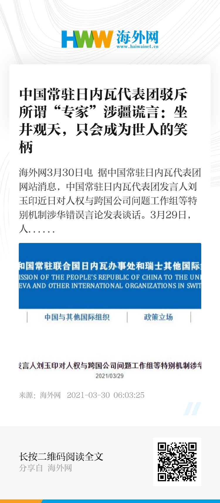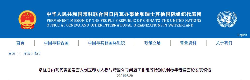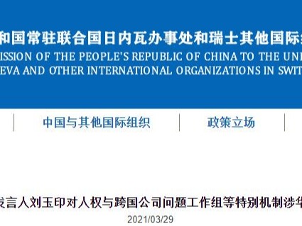 海外网3月30日电 据中国常驻日内瓦代表团网站消息,中国常驻日内瓦代表团发言人刘玉印近日对人权与跨国公司问题工作组等特别机制涉华错误言论发表谈话。