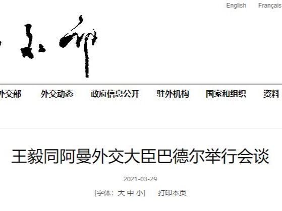 当地时间2021年3月29日,国务委员兼外长王毅在马斯喀特同阿曼外交大臣巴德尔举行会谈。