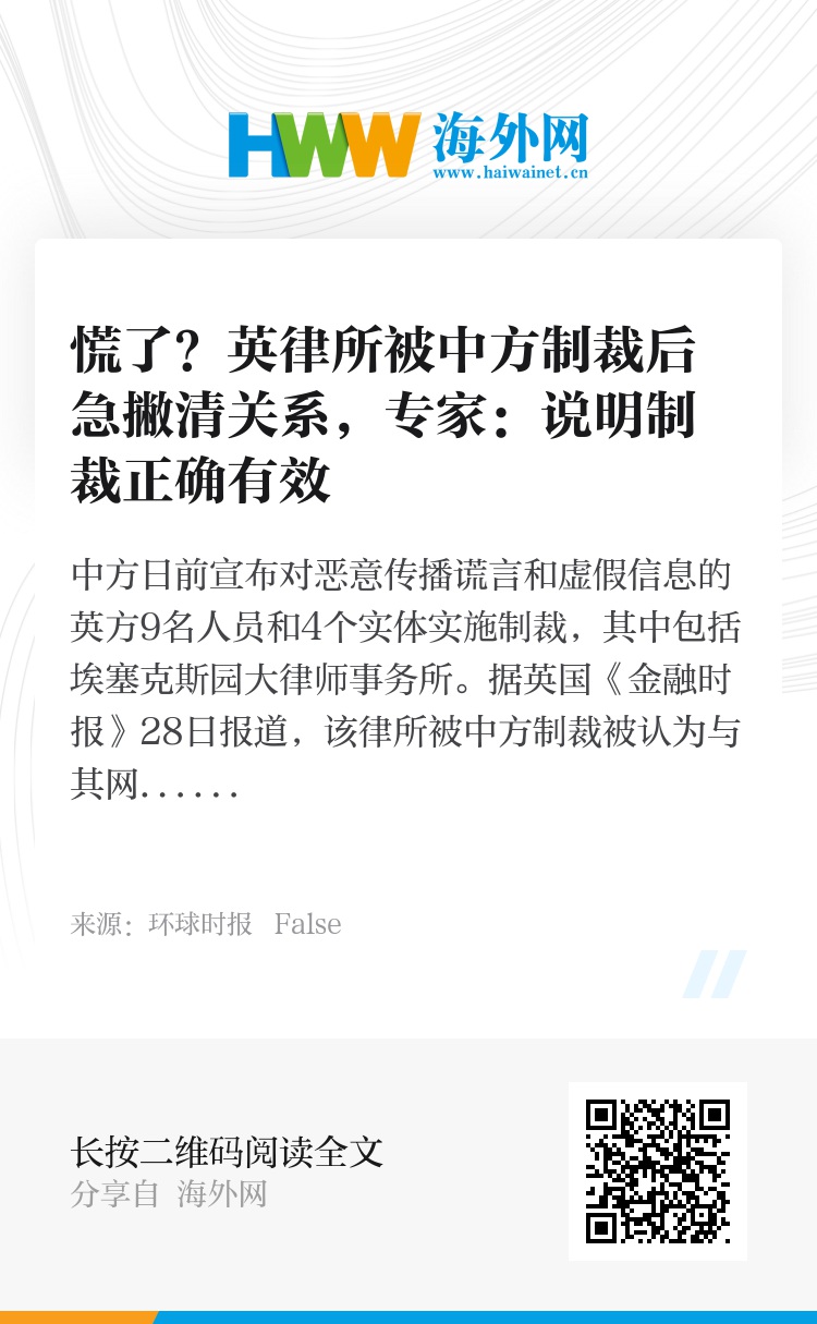 原标题:英律所被中方制裁后急撇清关系,专家:说明中国制裁正确又有效
