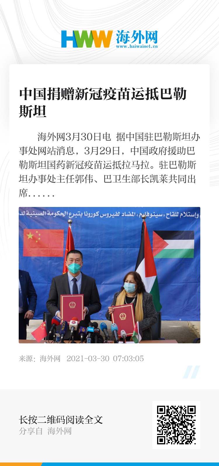 海外网3月30日电 据中国驻巴勒斯坦办事处网站消息,3月29日,中国政府援助巴勒斯坦国药新冠疫苗运抵拉马拉。驻巴勒斯坦办事处主任郭伟、巴卫生部长凯莱共同出席在巴卫生部举行的疫苗交接仪式。