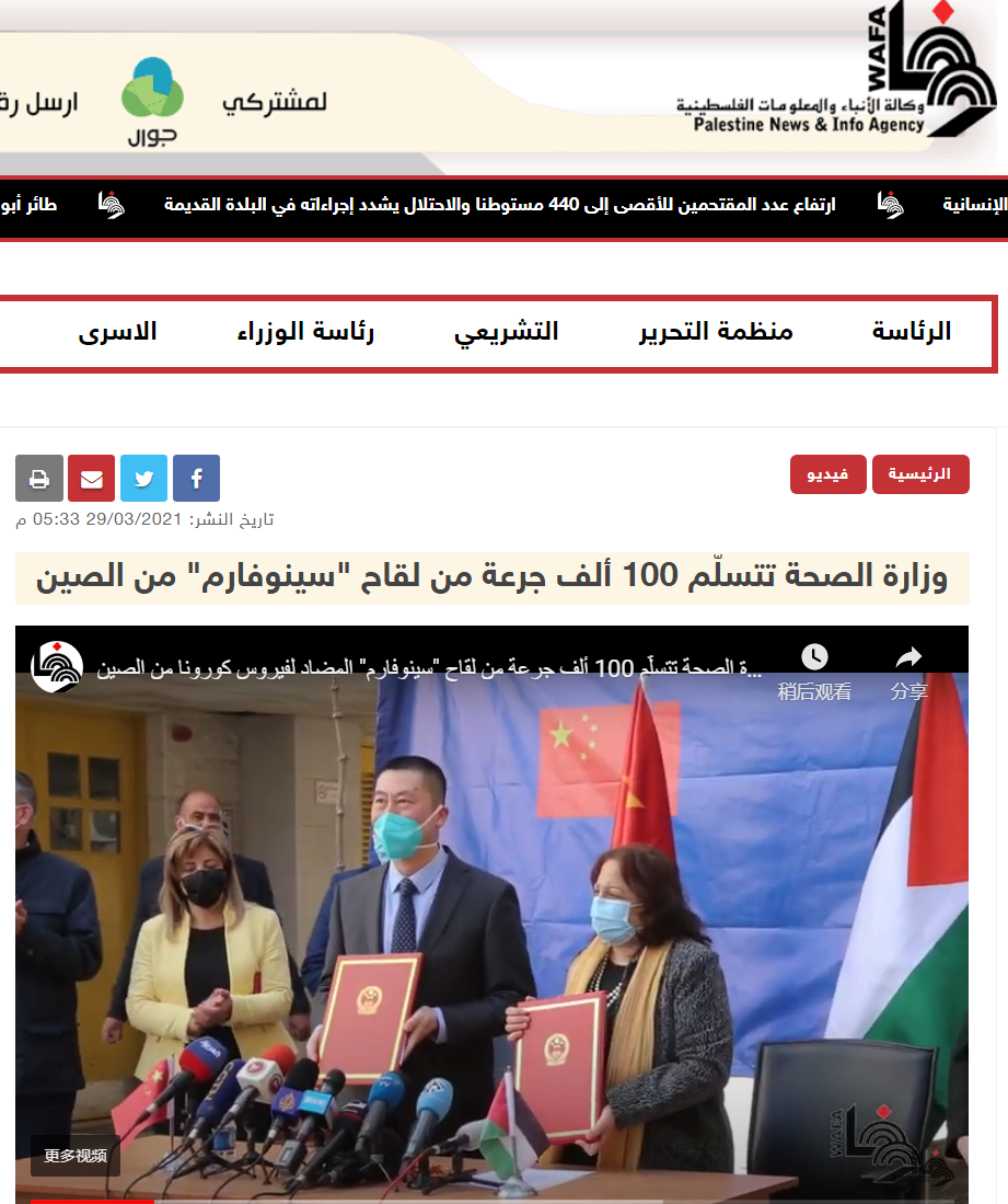 不久前,中国国务委员兼外长王毅在接受阿拉伯媒体采访时表示,中国对阿拉伯国家的抗疫合作实现了“全覆盖”,无论是巴勒斯坦人民及周边的巴难民,还是叙利亚等冲突地区人群,中国的抗疫援助从未缺席,迄今已向17个阿拉伯国家及阿盟援助和出口疫苗。中国和巴勒斯坦等阿拉伯国家守望相助,树立了携手抗疫的典范,阐释了共克时艰的真谛。