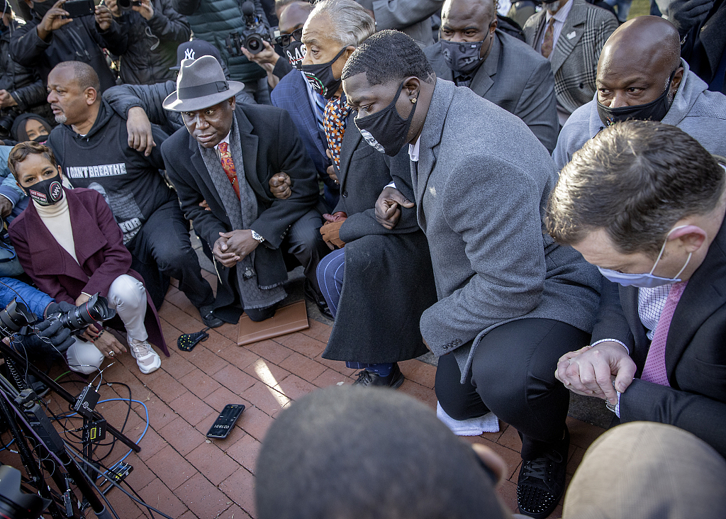 当地时间3月29日,美国“弗洛伊德案”涉事前警察德雷克·肖万被控谋杀一案正式开庭审理。据当地媒体报道,在庭审开始前,死者家属和律师在明尼阿波利斯当地法庭外以跪姿向死者乔治·弗洛伊德致哀,时间长达8分46秒,还原被告肖万跪在死者脖子上致其身亡的时长。图片来源:人民视觉