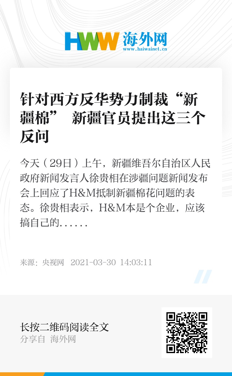 徐贵相表示,H&M本是个企业,应该搞自己的经营活动,不应把经济行为政治化。为什么要参与到政治活动中去呢?无非是受一些谣言影响,认为新疆棉花行业存在“强迫劳动”。西方一些反华势力也据此对新疆棉花行业进行制裁。