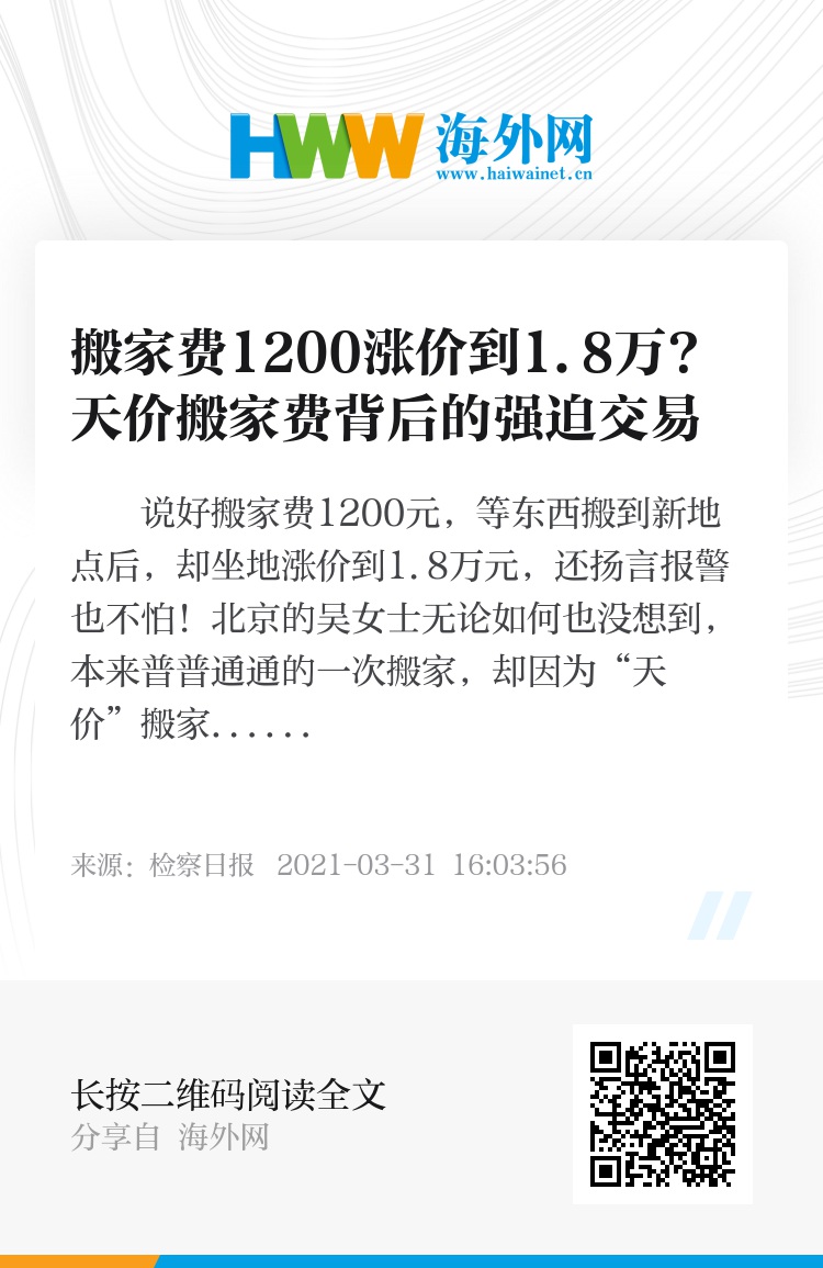说好搬家费1200元,等东西搬到新地点后,却坐地涨价到1.8万元,还扬言报警也不怕!北京的吴女士无论如何也没想到,本来普普通通的一次搬家,却因为“天价”搬家费而成了自己的一场劫难。