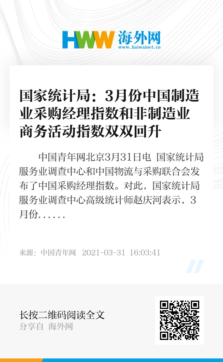 中国青年网北京3月31日电 国家统计局服务业调查中心和中国物流与采购联合会发布了中国采购经理指数。对此,国家统计局服务业调查中心高级统计师赵庆河表示,3月份中国制造业采购经理指数、非制造业商务活动指数和综合PMI产出指数分别为51.9%、56.3%和55.3%,比上月上升1.3、4.9和3.7个百分点,我国经济总体延续扩张态势。
