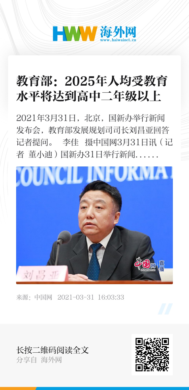 教育部发展规划司司长刘昌亚表示,2020年,我国劳动年龄人口(16-59岁的劳动力)平均受教育年限为10.8年,到“十四五”末期,这一数字将提至11.3年,即2025年,我国人均受教育水平将达到高中二年级以上。