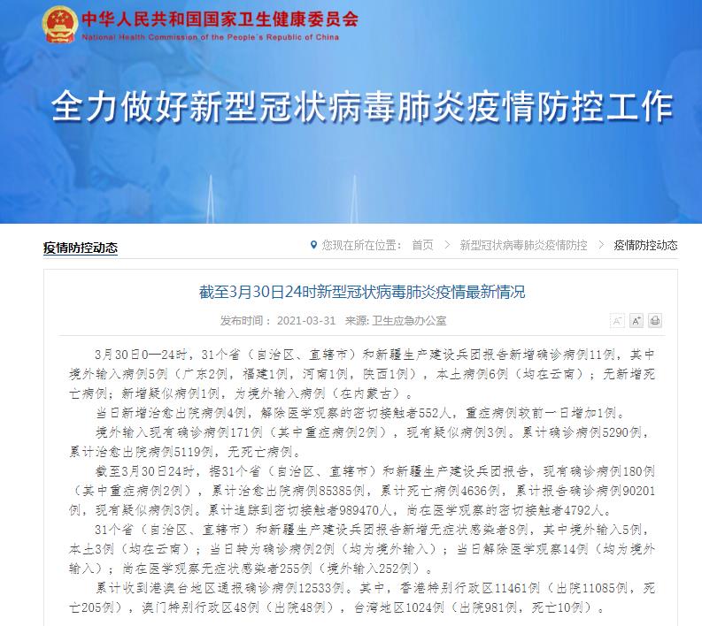 中国网3月31日讯 据国家卫生健康委员会官方网站消息,3月30日0—24时,31个省(自治区、直辖市)和新疆生产建设兵团报告新增确诊病例11例,其中境外输入病例5例(广东2例,福建1例,河南1例,陕西1例),本土病例6例(均在云南);无新增死亡病例;新增疑似病例1例,为境外输入病例(在内蒙古)。