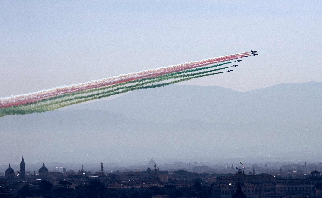 意大利特技飞行队空中表演 纪念意空军成立98周年