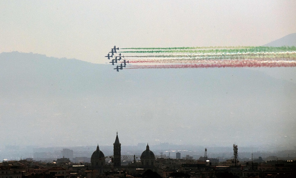 意大利特技飞行队空中表演 纪念意空军成立98周年