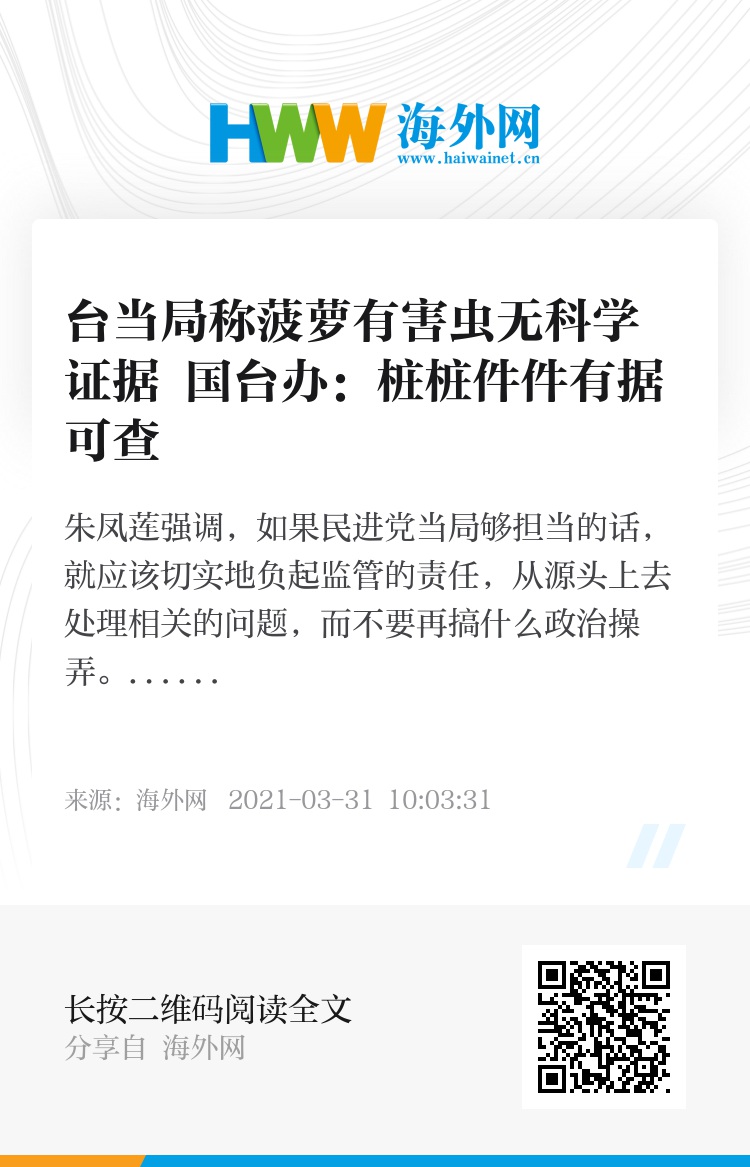 有记者提问,我们注意到,台农业主管部门声称,关于台湾地区菠萝不合格的情况,他们只收到了13件通报,而不是大陆所说的28件。对于查出菠萝的害虫,大陆方面也并没有提供过科学证据。请问对此您有何回应?