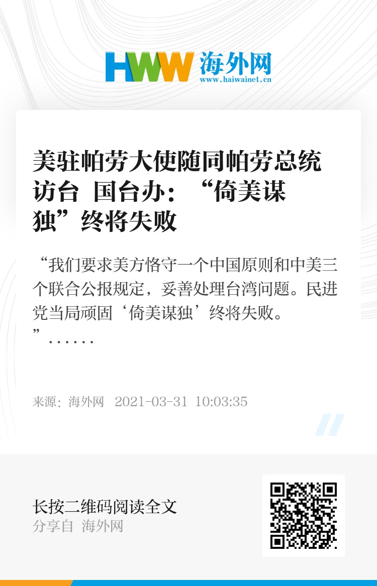 朱凤莲回应,在这个问题上,我们的立场是一贯的、明确的,就是坚决反对美国同中国台湾地区进行任何形式的官方往来。我们要求美方恪守一个中国原则和中美三个联合公报规定,妥善处理台湾问题。民进党当局顽固“倚美谋独”终将失败。(海外网 朱惠悦)