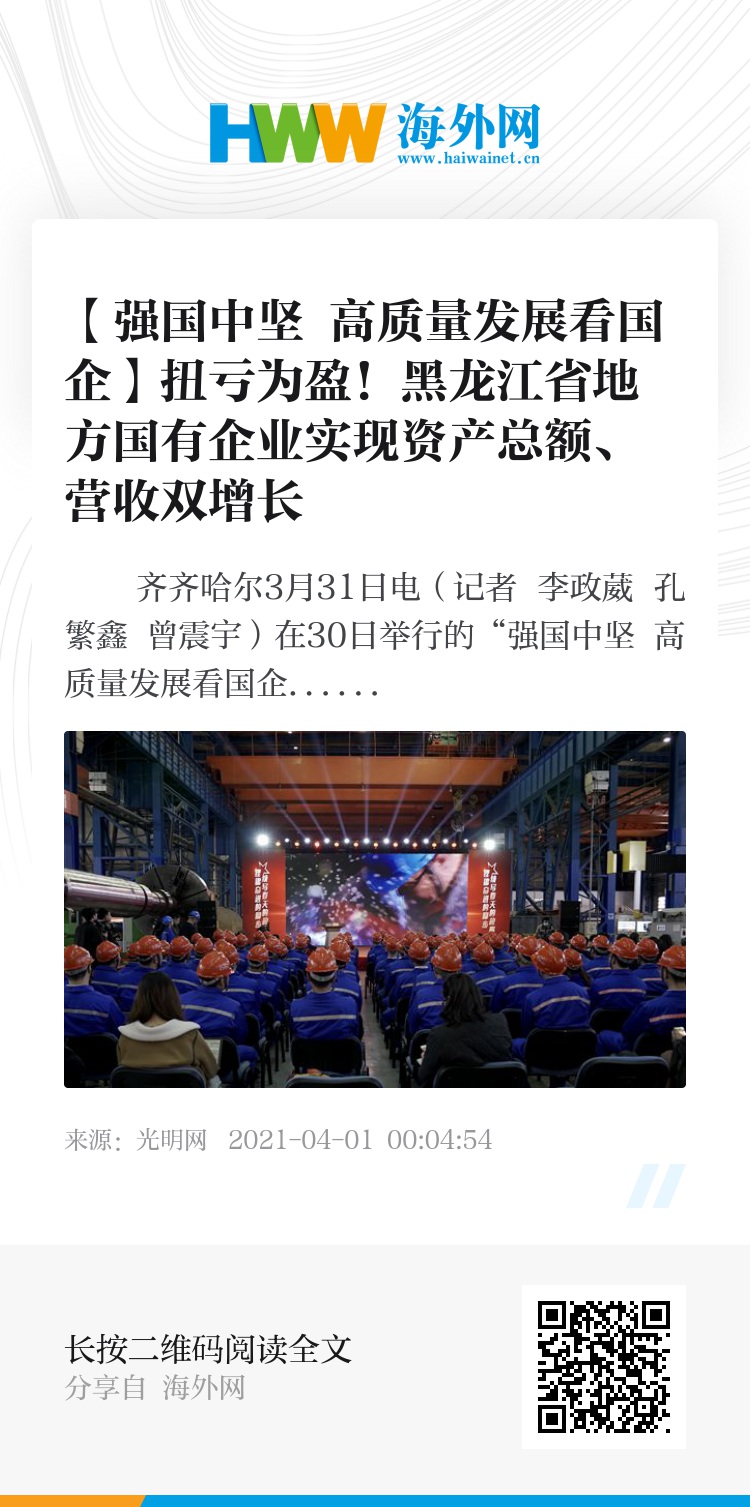 光明网齐齐哈尔3月31日电(记者 李政葳 孔繁鑫 曾震宇)在30日举行的“强国中坚 高质量发展看国企”网络主题活动分会场启动仪式上,黑龙江省国资委有关负责人在介绍黑龙江省地方国有企业基本现状时表示,截至2020年底,黑龙江省地方国有企业资产总额1.63万亿元,同比增长6.7%;实现营业收入1412亿元,同比增长12.22%;实现利润22.40亿元,实现扭亏为盈。