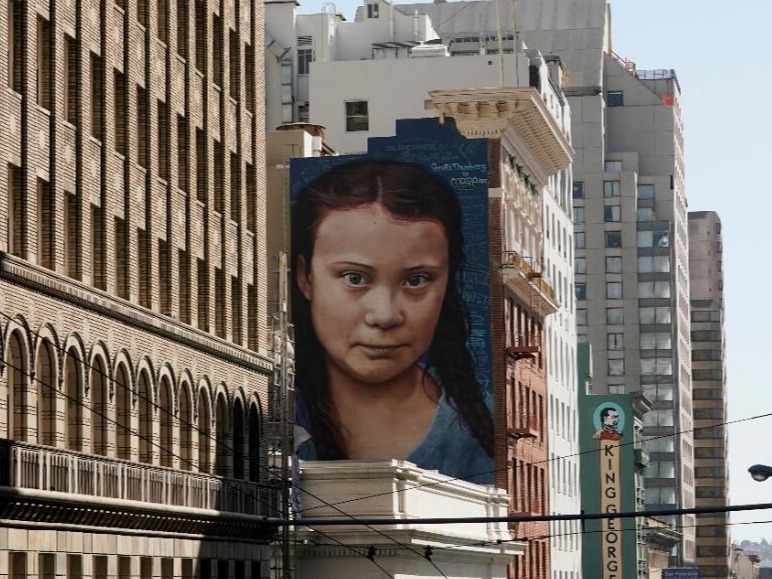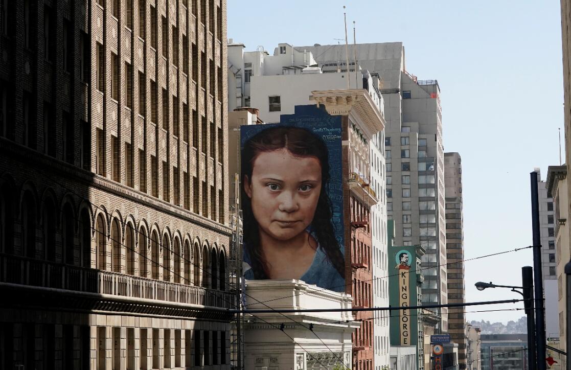 资料图:美国旧金山建筑物外墙上格蕾塔·通贝里的巨型壁画