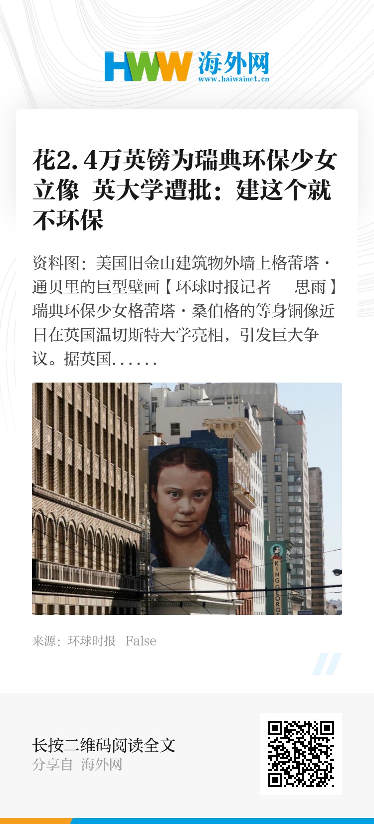 【环球时报记者 思雨】瑞典环保少女格蕾塔·桑伯格的等身铜像近日在英国温切斯特大学亮相,引发巨大争议。据英国《每日邮报》3月30日报道,这座铜像耗资2.4万英镑(约合22万元人民币),是全球首个桑伯格等身铜像。