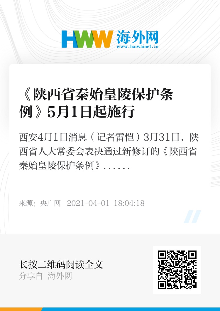 央广网西安4月1日消息(记者雷恺)3月31日,陕西省人大常委会表决通过新修订的《陕西省秦始皇陵保护条例》,将原《条例》由29条修订成37条,目的是进一步理顺管理体制,细化保护措施,促进展示利用;该《条例》将于2021年5月1日起正式施行。