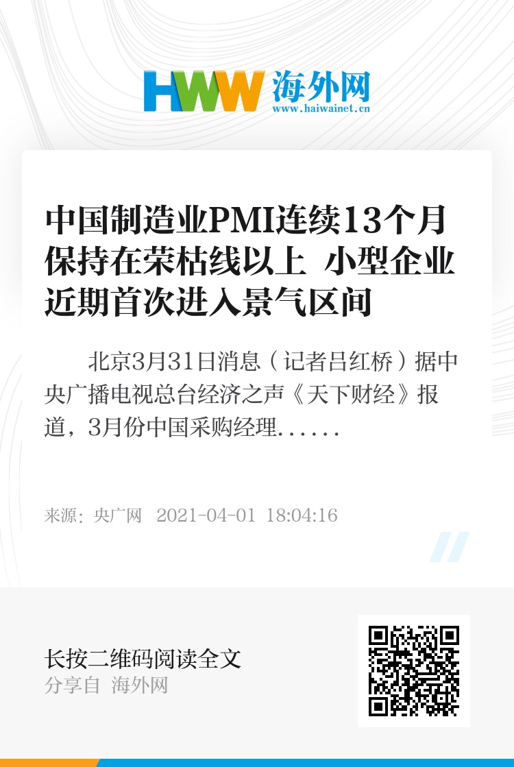 央广网北京3月31日消息(记者吕红桥)据中央广播电视总台经济之声《天下财经》报道,3月份中国采购经理指数31日发布,制造业PMI为51.9%,连续13个月保持在荣枯线以上,反映制造业持续扩张。数据同时显示,制造业供需两端同步回升,进出口继续改善,小型企业近期首次进入景气区间。专家分析,当前宏观经济保持恢复态势,需要着力扩大内需,降低企业成本压力。