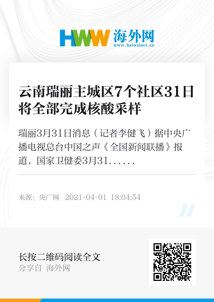 3月31日8时起,瑞丽市对主城区7个社区开展全员核酸采样检测,计划到3月31日24时全部完成核酸采样,核酸检测所有费用由政府承担。瑞丽市人民政府副市长杨谋表示:“根据网格片区划分,由各网格责任单位负责牵头组织开展。城区居民全员居家隔离,时间暂定为一周,根据检测情况确定具体解除时间。统筹组织了德宏州和周边州市1800人的核酸采样队伍,核酸检测所需物资已全部准备就绪,能够满足全员核酸检测需要。目前瑞丽市的核酸检测能力为单检15480人份。”