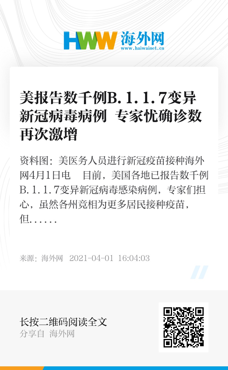 海外网4月1日电 目前,美国各地已报告数千例B.1.1.7变异新冠病毒感染病例,专家们担心,虽然各州竞相为更多居民接种疫苗,但这种变异病毒仍可能会助长新冠病毒感染者的再次激增。