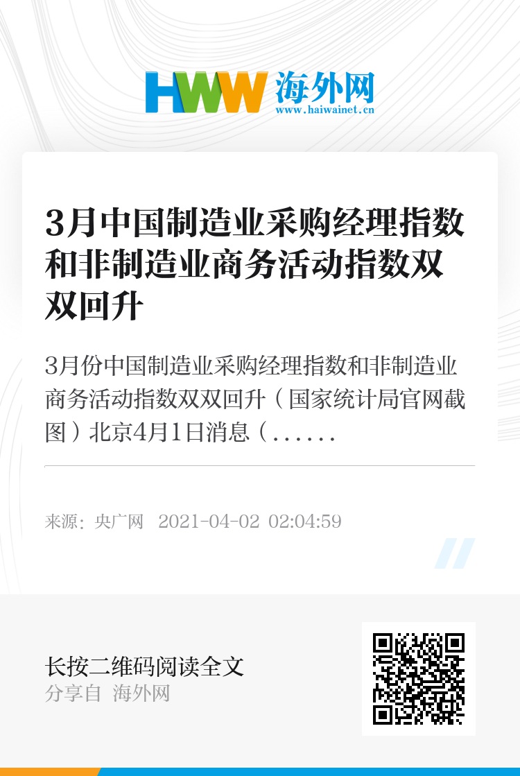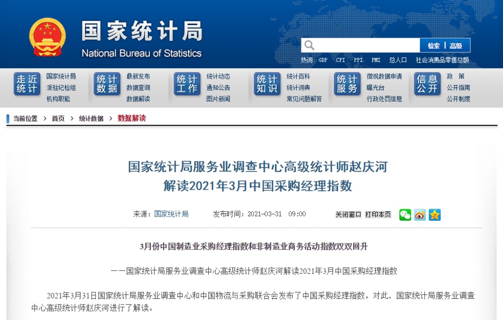 3月份中国制造业采购经理指数和非制造业商务活动指数双双回升(国家统计局官网截图)